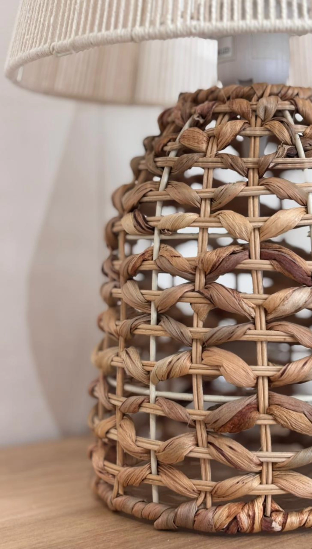 Lampara de mesa /velador con base de fibras naturales y pantalla tejida en cordon natural.
